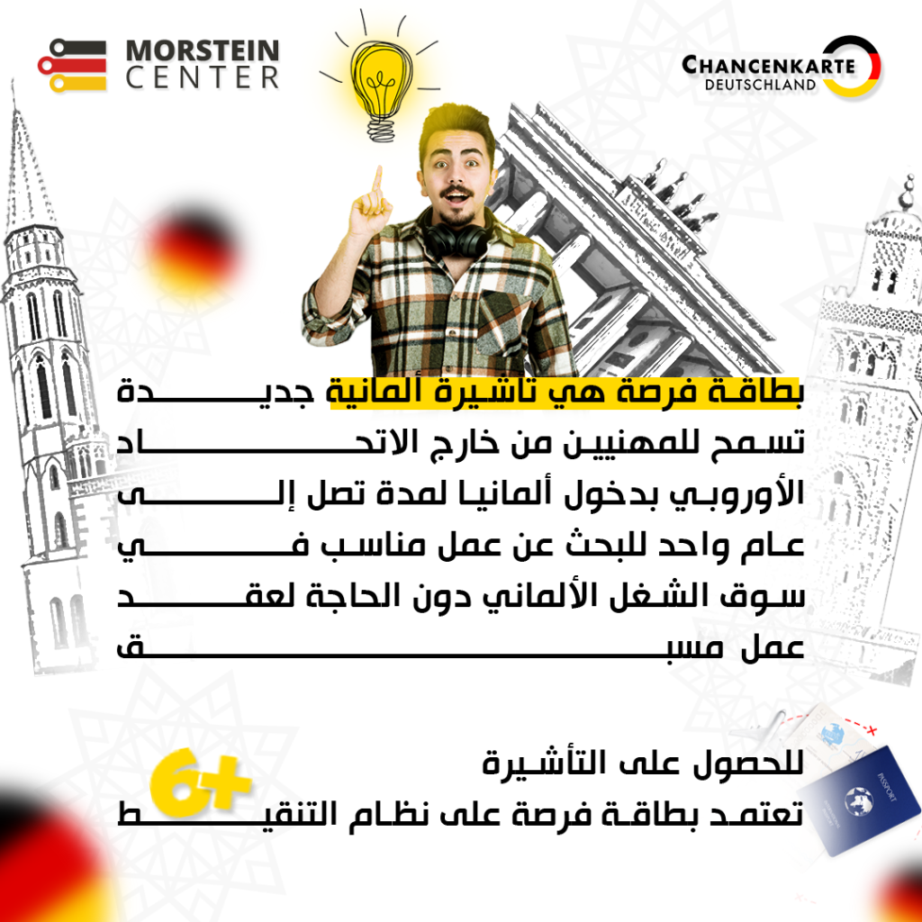 La carte de chance (ChancenKarte) permet aux ressortissants de pays non membres de l’UE d’entrer en Allemagne pour y chercher un emploi approprié. Vous n’avez pas besoin d’un contrat de travail fixe. La carte des chances est attribuée à celui qui est reconnu comme spécialiste ou à celui qui obtient au moins six points dans le système de points. En outre, la subsistance doit être assurée pour la durée du séjour.