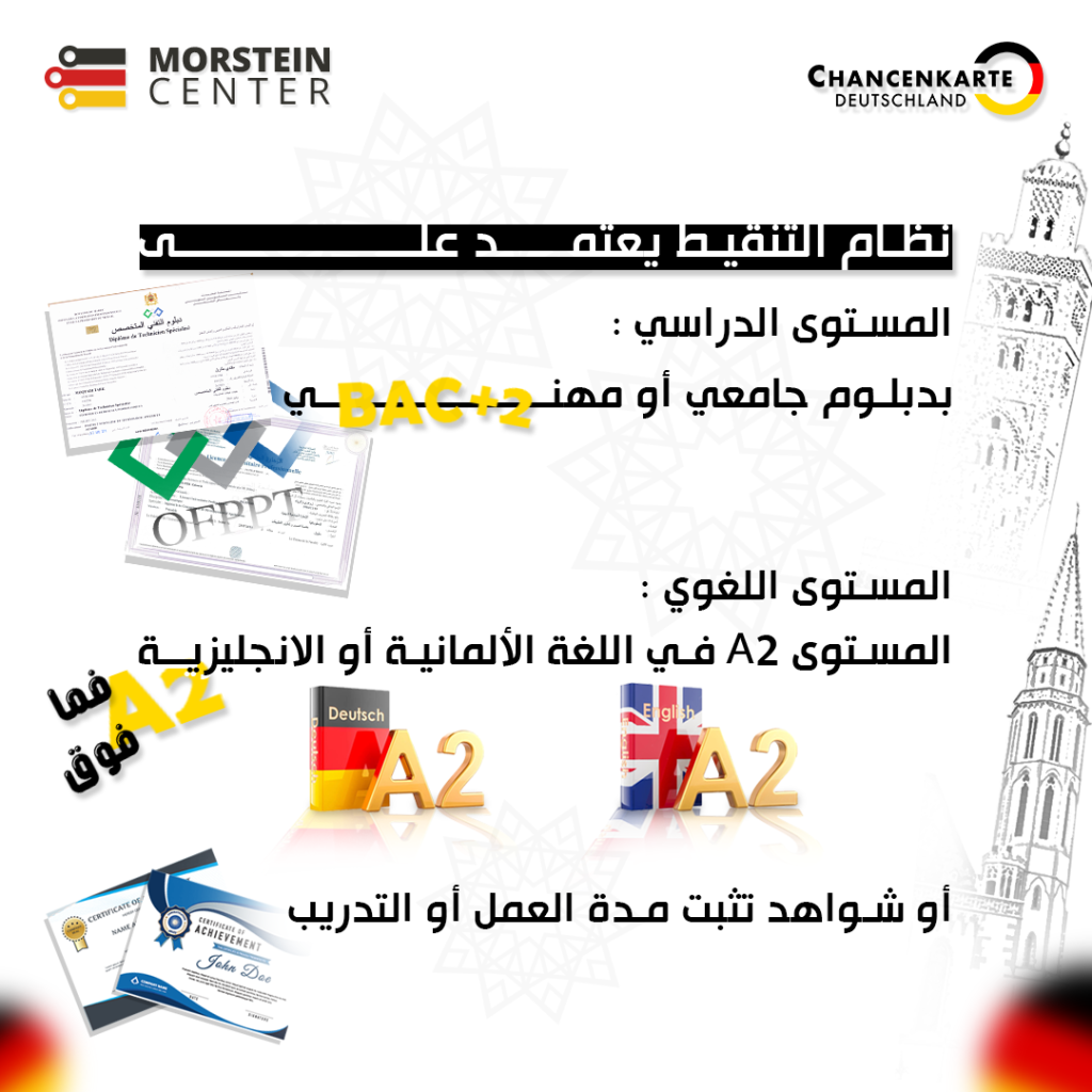 Un système de points vous permet de comparer vos qualifications avec les critères de sélection requis. Vous devez obtenir un total de six points pour recevoir la Carte des opportunités. Les conditions de base sont des connaissances en allemand de niveau A1 ou en anglais de niveau B2, ainsi qu’une formation professionnelle d’au moins deux ans ou un diplôme de l’enseignement supérieur reconnu dans votre pays d’origine. De plus, vous devez prouver que vous disposez de moyens financiers suffisants, par exemple via un emploi secondaire (jusqu’à 20 heures par semaine) que vous attestez avec un contrat de travail. (Ces conditions de base ne rapportent aucun point !) Les autres critères du système de points sont les compétences linguistiques, l’expérience professionnelle, l’âge et les « liens avec l’Allemagne ». L’âge pris en compte est celui au moment de la demande.